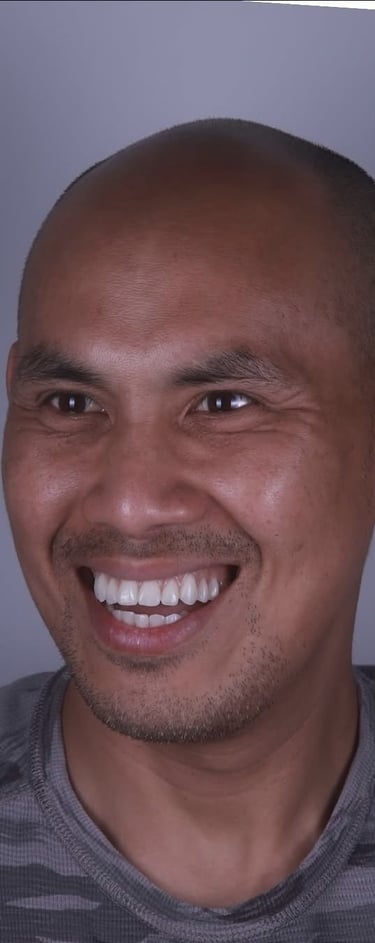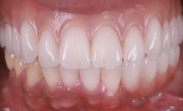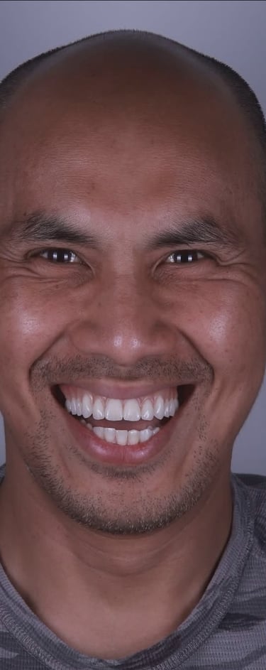 El resultado es una transformación espectacular de la sonrisa. Se observa una dentadura completa y uniforme, donde todos los dientes faltantes han sido reemplazados. Los dientes tienen un color blanco brillante y una forma perfecta, simétrica y de tamaño ideal. En la vista de cerca, se aprecia el trabajo de precisión: los nuevos dientes están perfectamente alineados, cubriendo la totalidad de la encía visible y logrando una estética natural y saludable, lo cual resulta en una sonrisa radiante y completa en las vistas del rostro.