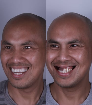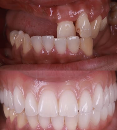 Este caso revela una condición de la boca que requería una corrección extensa. Se observa la pérdida de múltiples dientes en la arcada superior frontal, dejando un espacio considerable que afecta la estética de la sonrisa. Los dientes restantes están notablemente desgastados, cortos y con una tonalidad amarillenta, y algunos presentan astillados o daños estructurales. En la vista de cerca, es claro que la boca no solo carece de piezas dentales clave, sino que la forma y el color de los dientes presentes no son uniformes ni armónicos, lo cual exige una rehabilitación completa.